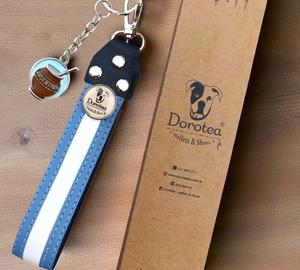 El llavero, con su cinta en polipiel en celeste y blanco y un dije de mate grabado en metal y con aplique de color en resina, es mucho más que un accesorio: es un gesto cotidiano que conecta con nuestras costumbres más queridas. Ideal para regalar o llevar como amuleto de identidad.